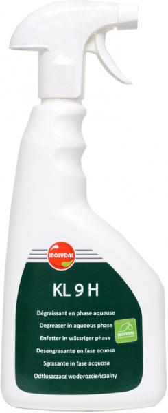 KL 9 H je Čisticí a odmašťovací přípravek pro nástroje, stroje, lisovací nástroje a formy i podlahy. Může být použit na všechny materiály a může se zahřát a použít v myčkách bakteriologických nástrojů. Slouží k odstranění tuků, olejů, použitých olejů a olejových nebo voskových dočasných ochran v potravinářském, zemědělsko-potravinářském i strojírenském a leteckém průmyslu. Aplikace postřikem, ponorem, štětcem, hadříkem, v mycích zařízeních a mycích stolech (i biologických) .