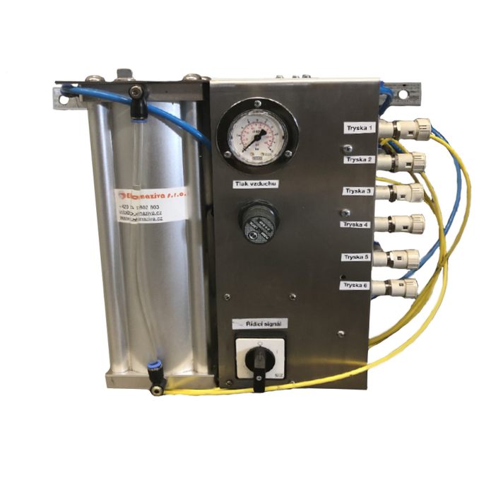 Automatický dávkovací systém může být vybaven až 8 sprejovými tryskami v nerezovém boxu. Systém