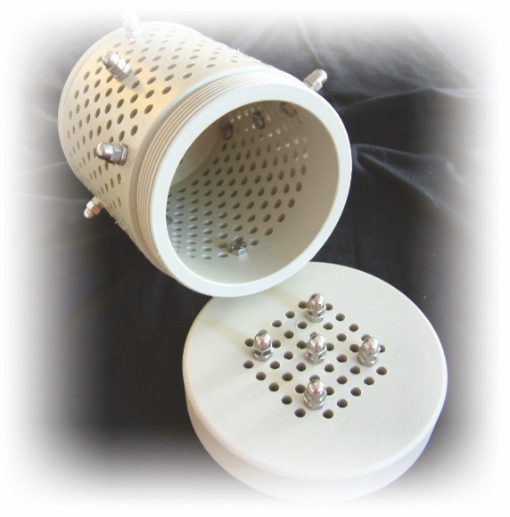 Tento "buben v bubnu" může být použit pro pokovení menších výrobků tak, že tento malý buben s výrobky umístíte do velkého galvanizačního bubnu. Je vyroben ze šedého PP a má nerezové šrouby s hlavičkou jako kontakty.