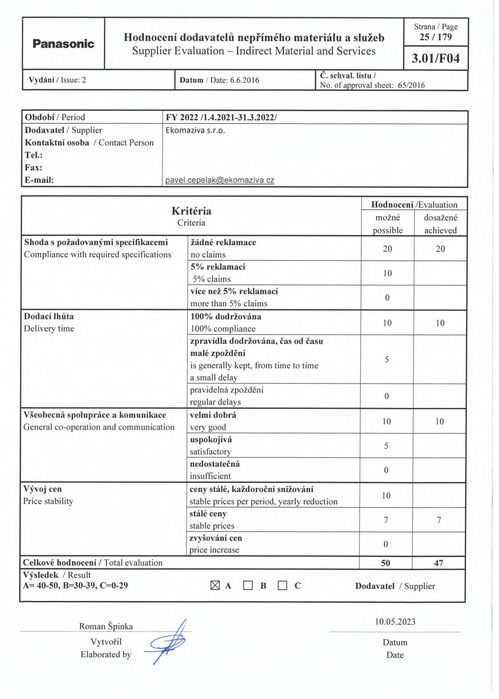 Jsme dlouholetým dodavatelem pomocných materiálů pro společnost Panasonic. Opakovaně v hodnocení dodavatelů jsme v kategorii A.  To je důvod se i trochu pochlubit.